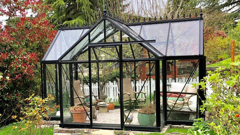 The Junior Victorian Orangerie offers a timeless English greenhouse experience, ideal for both hobby gardening and social gatherings. Its refined aluminum frame is now the same strength as the Royal Units, featuring a distinctive T-shaped design and ornate roof ridge, adding a touch of elegance to any backyard setting.