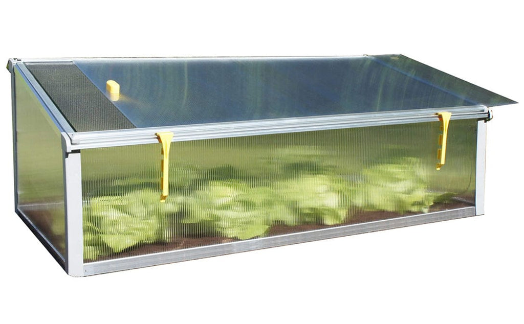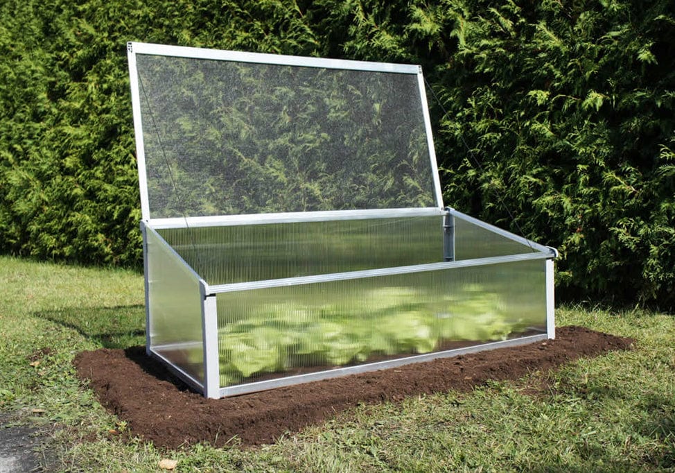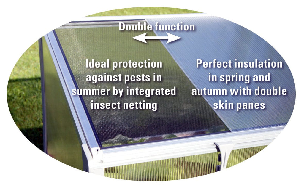 Year-Round Cold-Frame: Mini greenhouse designed for both cold and warm weather - hassle free. In warm weather, slide the twin-wall polycarbonate cover out of the lid frame to reveal screen cover (protects against insects and bad weather such as wind and hail). Made in Austria. Product is Patented. 4 mm twin-wall polycarbonate. (2-year warranty) Size: 50" W x 23" D x 12" & 16" H